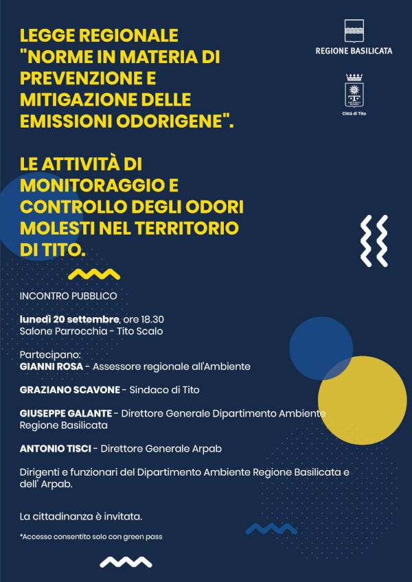 Con questo obiettivo, lunedì 20 settembre, a partire dalle ore 18:30, nel salone della parrocchia di Tito Scalo, si terrà un incontro pubblico per illustrare i contenuti della Legge Regionale “Norme in materia di prevenzione e mitigazione delle emissioni odorigene” e le attività di monitoraggio e controllo degli odori molesti nel territorio di Tito.