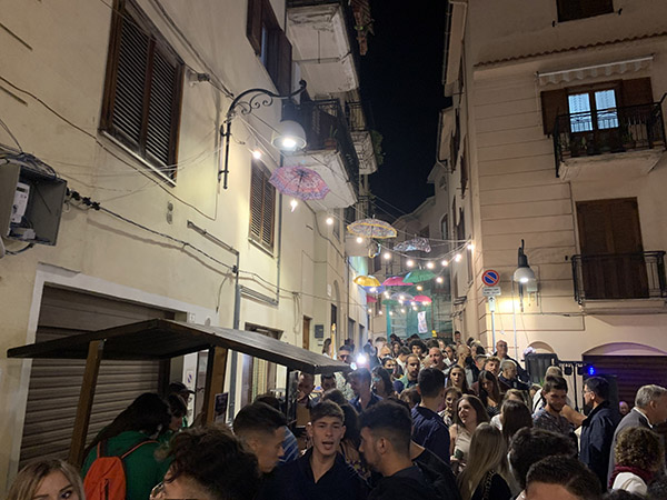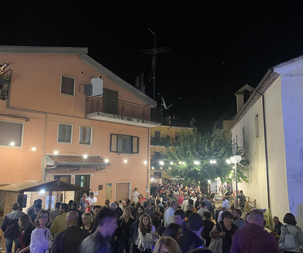 Dalla piazza della Vigna della Corte con gli antipasti (ciambottola, patate rosse, uovo fritto con cruschi, tagliere vietrese, arrosticini, bombette di carne, provolone impiccato, calzoni con la minestra, fiori di zucca e zeppole fritte, acquasale e spighe), poi in viale degli Artigiani (con strufoli e vino vietrese e diversi artigiani che hanno messo in mostra i loro lavori).