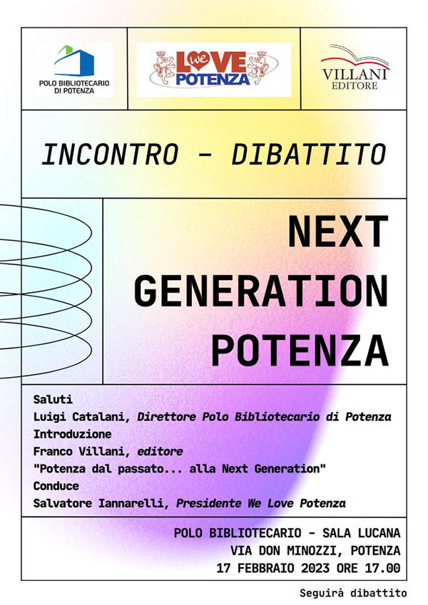 L’invito è per tutta la cittadinanza presso la Sala Lucana della Biblioteca Nazionale di Potenza per il prossimo venerdì 17 febbraio, alle ore 17:00 in occasione dell’incontro-dibattito “Next Generation Potenza”.