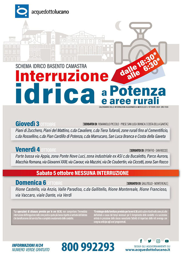 Il Tavolo Tecnico Regionale (del quale fanno parte Protezione Civile, Regione Basilicata, Egrib, Acque del Sud, Acquedotto Lucano e Anci) ha stabilito il nuovo programma di sospensioni idriche che interessa il COMUNE DI POTENZA E LE AREE RURALI, a decorrere da oggi giovedì 3 ottobre.