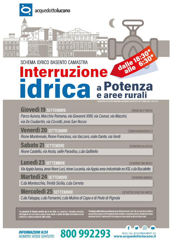 A partire da Giovedì 19 Settembre e fino a Mercoledì 25 Settembre sono in programma interruzioni idriche in tutti i comuni della provincia a partire dalle 18:30 e fino alle 06:30 del giorno successivo.