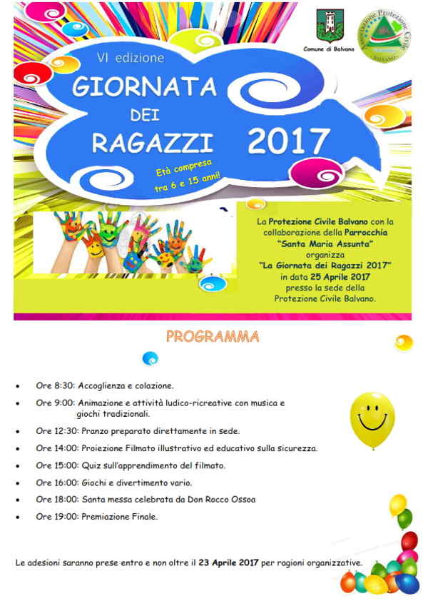 La Protezione Civile di Balvano (Potenza), in collaborazione con la Parrocchia Santa Maria Assunta, organizza, per il sesto anno consecutivo, “La Giornata dei Ragazzi 2017”.