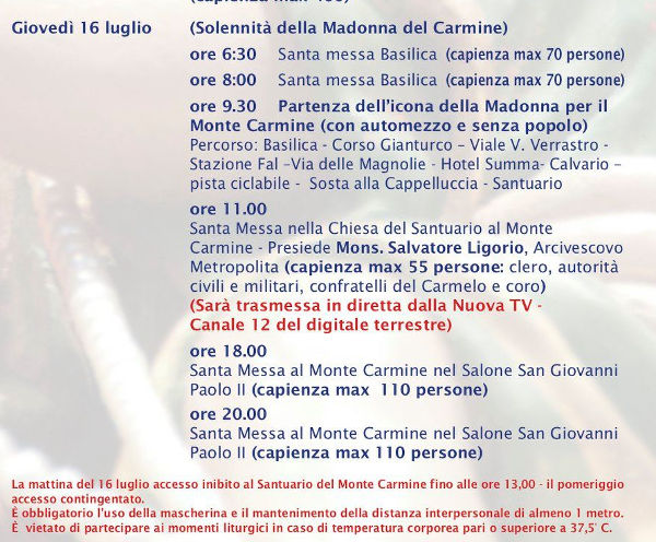 Come detta la tradizione religiosa, dal 7 al 15 Luglio si sviluppa la novena in onore della Vergine, che anticipa la processione del 16.