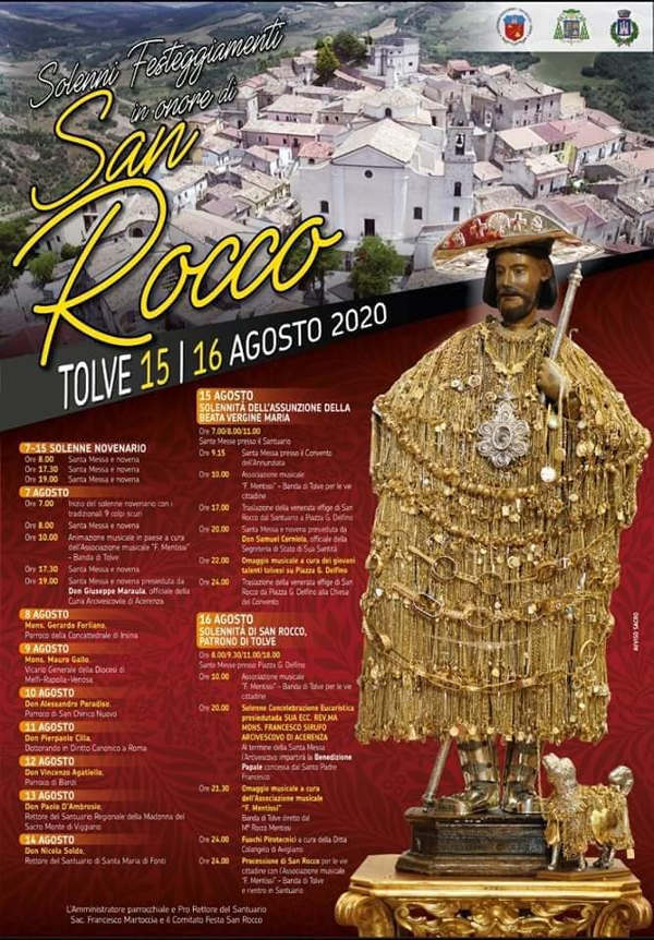 Tra i tanti paesi della nostra Regione in cui il San Rocco è venerato e festeggiato, il primo posto è certamente riconosciuto a Tolve, paese che vanta una lunga e vivace tradizione del culto per il Santo che ogni anno richiama (nella duplice ricorrenza del 16 Agosto e 16 Settembre) decine di migliaia di pellegrini da tutta la regione e dalle regioni vicine, come testimoniano le migliaia di ex voto conservati nella “Casa del Pellegrino“.