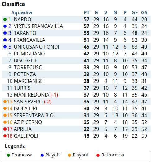 Ecco di seguito tutte le altre partite della 30esima giornata di serie D girone H e la classifica.