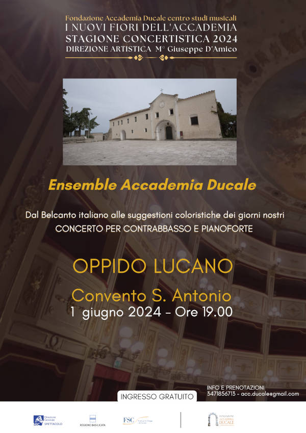 Sabato 1 giugno 2024, presso il Convento S. Antonio a Oppido Lucano alle 19.00, l’Ensemble Accademia Ducale terrà il concerto Dal Belcanto italiano alle suggestioni coloristiche dei giorni nostri, secondo dei quattro che saranno realizzati dal duo formato da Giuseppe D’Amico al contrabbasso e Aurelio Coviello al pianoforte, pregevoli musicisti lucani, con grande esperienza internazionale.
