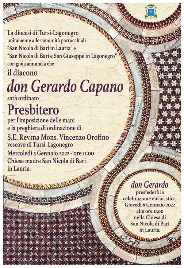 Don Gerardo presiederà per la prima volta la celebrazione eucaristica Giovedì 6 Gennaio 2022, alle ore 11:00, nella Chiesa di “San Nicola di Bari” in Lauria.