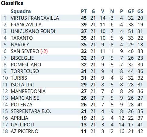Ecco di seguito tutti i risultati della 21esima giornata relativi alla serie D girone H e la classifica aggiornata.