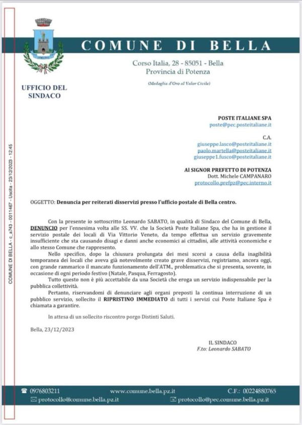 Riceviamo e pubblichiamo un comunicato stampa di Vito Leone, promotore del Comitato per l’Ufficio postale di Bella e