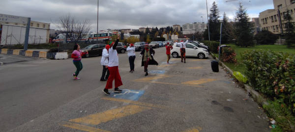 Armati di buon umore, di una cassa, dei nostri abiti più colorati (perché dall’alto ci potessero vedere) sulle note di Jerusalema (diventato il nostro cavallo di battaglia dopo il flashmob organizzato in data 23 ottobre in Piazza Mario Pagano) ci siamo dati appuntamento sotto il padiglione E dell’ospedale San Carlo per ballare e regalare pochi minuti di spensieratezza a quanti (ricoverati, medici, infermieri, oss ecc..) ci hanno osservati dalle finestre.