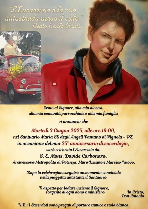 “Grato al Signore, alla mia diocesi, alla mia comunità parrocchiale e alla mia famiglia vi annuncio che oggi Martedì 3 Giugno 2025 alle ore 19:00 nel Santuario Maria SS degli Angeli Pantano di Pignola (PZ) in occasione del mio 25° anniversario di sacerdozio, sarà celebrata l’eucarestia da Mons. Davide Carbonaro, Arcivescovo Metropolita di Potenza, Muro Lucano e Marsico Nuovo.