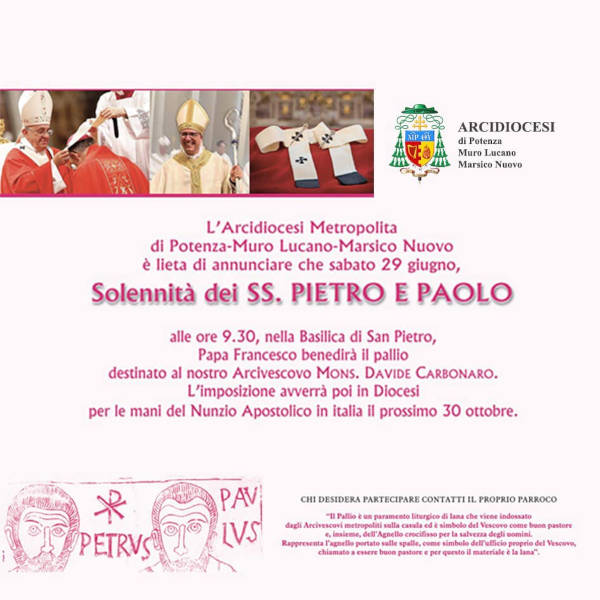 L’Arcidiocesi Metropolita di Potenza-Muro Lucano-Marsico Nuovo è lieta di annunciare che sabato 29 giugno, Solennità dei SS. PIETRO E PAOLO alle ore 9.30, nella Basilica di San Pietro, Papa Francesco benedirà il pallio destinato al nostro Arcivescovo MONS. DAVIDE CARBONARO.
