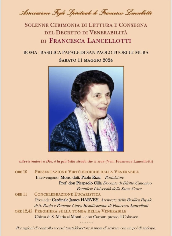 “Appuntamento a Roma per sabato 11 Maggio per la Solenne Cerimonia di Lettura e Consegna del Decreto di Venerabilità della nostra concittadina Francesca Lancellotti.