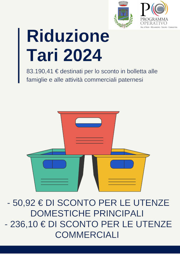 In concomitanza con l’emissione dei ruoli della Tari, il Sindaco di Paterno e l’Amministrazione comunale hanno comunicato ai propri cittadini che del con atto deliberativo di Giunta, poi ratificato dal Consiglio comunale del 18/07/2024, è stato stabilito di utilizzare fondi Re.P.O.V. e RIPOV rinvenienti dal P.O. Val d’Agri per applicare uno sconto in bolletta ad ogni contribuente paternese.