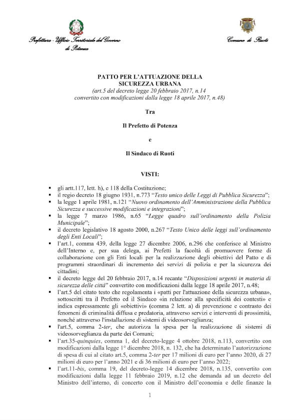 È stato siglato infatti il Patto per l’attuazione della sicurezza urbana tra il Prefetto di Potenza e il Sindaco di Ruoti incentrato su due azioni fondamentali: prevenzione di atti illegali e promozione del decoro urbano.