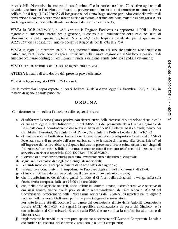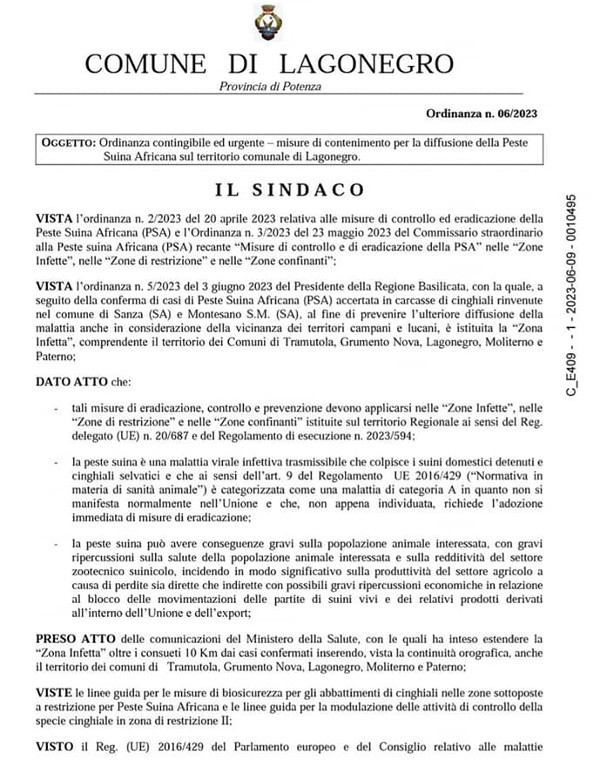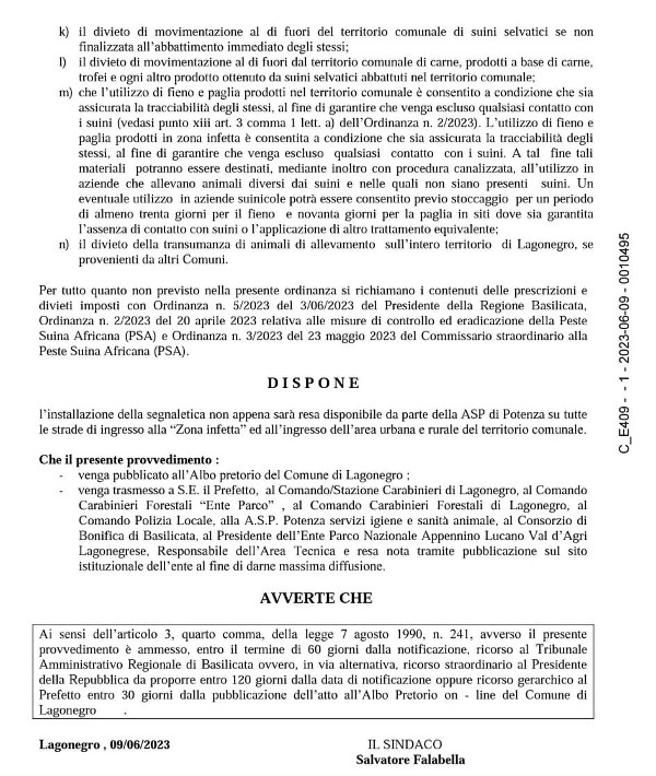 Il Sindaco di Lagonegro, Salvatore Falabella, ha adottato l’Ordinanza n. 6 del 9.06.2023 recante misure di contenimento per la diffusione della Peste Suina Africana sul territorio comunale di Lagonegro.