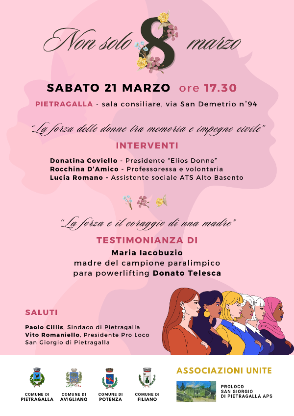 Si terrà domani, sabato 21 marzo alle ore 17:30, presso la sala consiliare di Pietragalla, si terrà il terzo appuntamento della rassegna “Non solo 8 marzo”, promossa dalle Associazioni Unite dei comuni di Pietragalla, Avigliano, Filiano e Potenza.