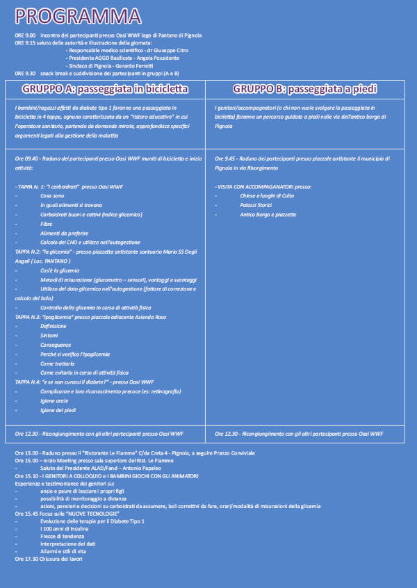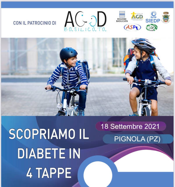 L’evento si terrà sabato 18 settembre a Pignola, si tratta di una passeggiata in bicicletta per bambini e ragazzi affetti da diabete di tipo 1, con delle tappe che prevedono un ristoro educativo: l’attenzione sarà focalizzata su alcuni temi tipici del diabete quali i carboidrati, la glicemia, l’ipoglicemia e le complicanze della patologia.