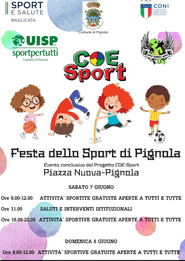 Due giornate all’insegna del movimento, del divertimento e della condivisione si svolgono in Piazza Nuova a Pignola per la Festa dello Sport, evento conclusivo del progetto COE-Sport, promosso da Sport e Salute Basilicata, il Comune di Pignola, il CONI regionale, la UISP Potenza e altre realtà del territorio.