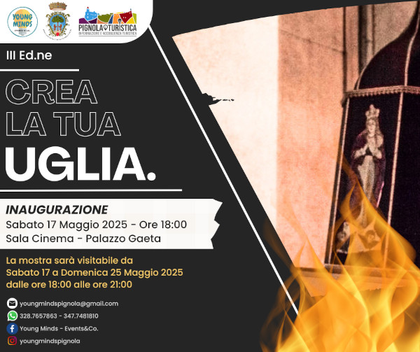 Si terrà Sabato 18 maggio 2025, alle ore 18:00, l’inaugurazione della Mostra Artistica “Crea la tua Uglia” , ormai giunta alla Terza Edizione, un evento promosso dall’associazione Young Minds – Events&Co., che si conferma ormai appuntamento atteso e consolidato all’interno del calendario culturale e religioso del paese di Pignola in occasione dei Festeggiamenti in onore di Maria SS. Degli Angeli.