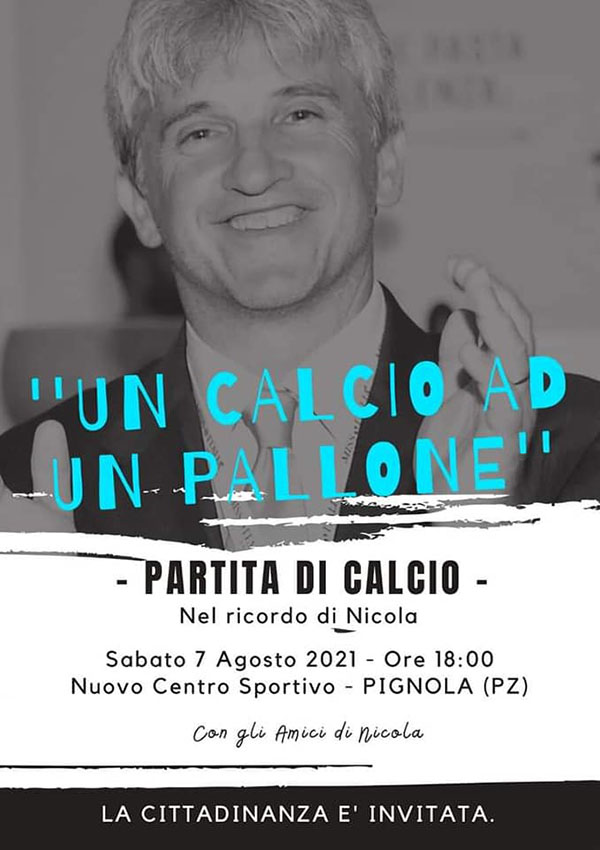 Il prossimo appuntamento per tenere vivo il ricordo di Nicola è previsto il 7 Agosto con una partita di calcio al Nuovo Centro Sportivo di Pignola.