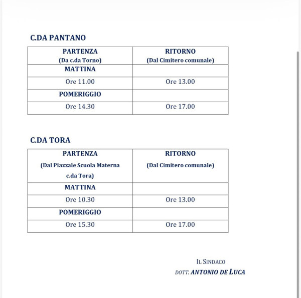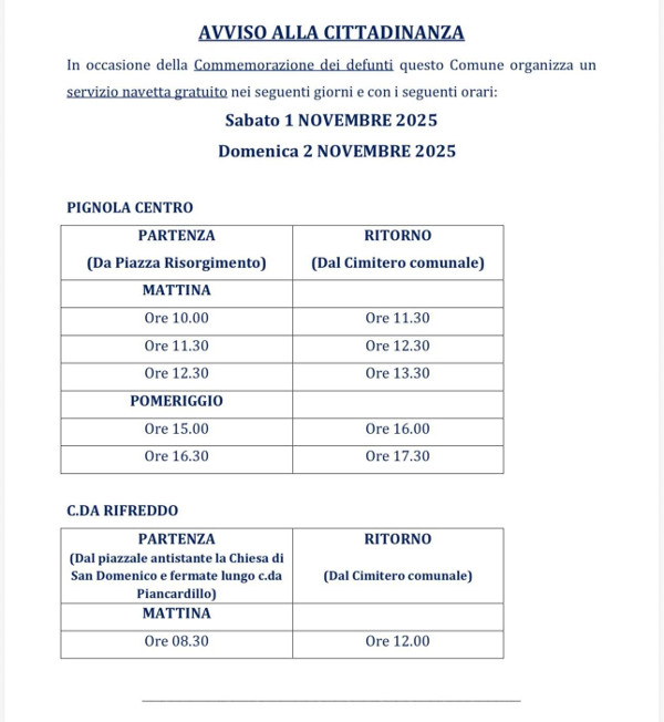 In occasione della 𝐂𝐨𝐦𝐦𝐞𝐦𝐨𝐫𝐚𝐳𝐢𝐨𝐧𝐞 𝐝𝐞𝐢 𝐃𝐞𝐟𝐮𝐧𝐭𝐢, il Comune di Pignola organizza un 𝐬𝐞𝐫𝐯𝐢𝐳𝐢𝐨 𝐧𝐚𝐯𝐞𝐭𝐭𝐚 𝐠𝐫𝐚𝐭𝐮𝐢𝐭𝐨 per il Cimitero Comunale nei seguenti giorni: