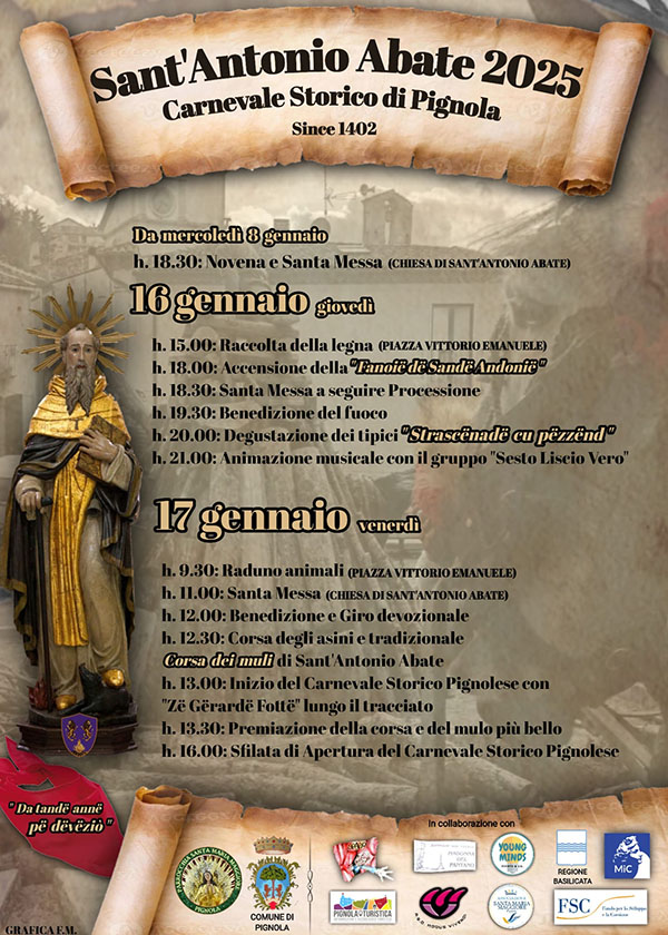 La festa di Sant’Antonio Abate, a Pignola, organizzata dalla Parrocchia, insieme al patrocinio del Comune e alla collaborazione di tante associazioni, coincide con l’inizio del Carnevale, e questi giorni per il popolo pignolese sono ricchi di tradizioni, momenti religiosi e di divertimento.