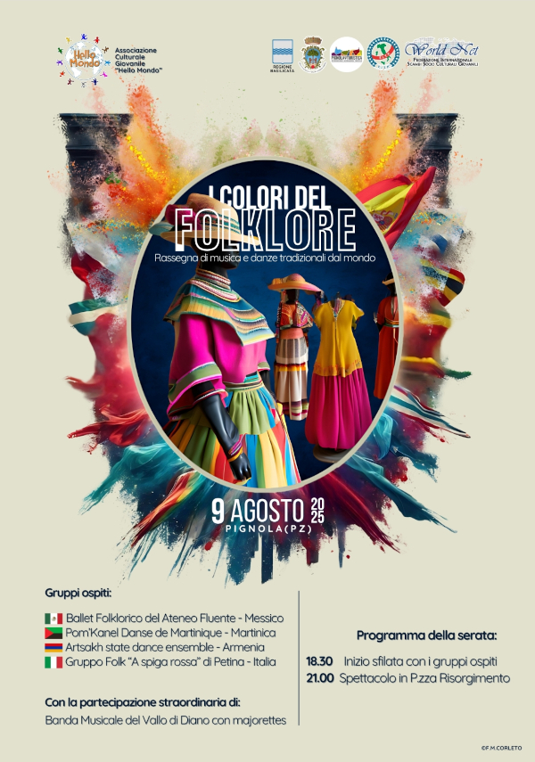 L’Associazione Culturale Giovanile Hello Mondo, presieduta da Donato Corleto, è lieta di presentare l’attesissima edizione 2025 de “I Colori del Folklore”, un evento che, anno dopo anno, si conferma come uno dei momenti più significativi del calendario culturale estivo lucano.