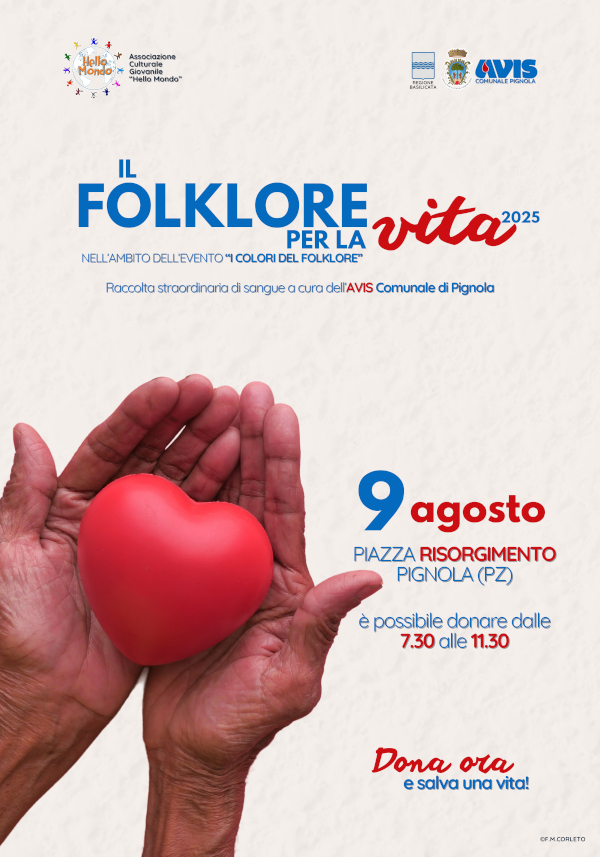 La manifestazione si aprirà già nella mattinata con un momento dedicato alla solidarietà: in collaborazione con l’AVIS di Pignola, si terrà la campagna “Il Folklore per la Vita”, una raccolta straordinaria di sangue finalizzata a sensibilizzare la cittadinanza sull’importanza della donazione.