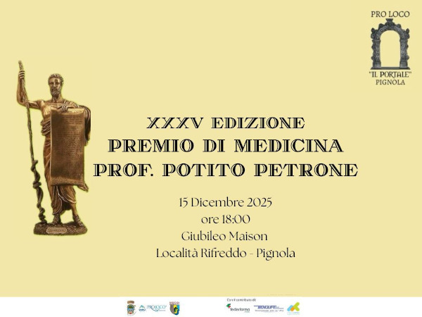 Lunedì 15 dicembre alle ore 18.00, presso il “Giubileo Maison” di Pignola, si terrà la cerimonia di premiazione della XXXV edizione del Premio di Medicina “Potito Petrone”, riconoscimento intitolato alla memoria del professor Potito Petrone, stimato medico e figura di riferimento per la comunità lucana.