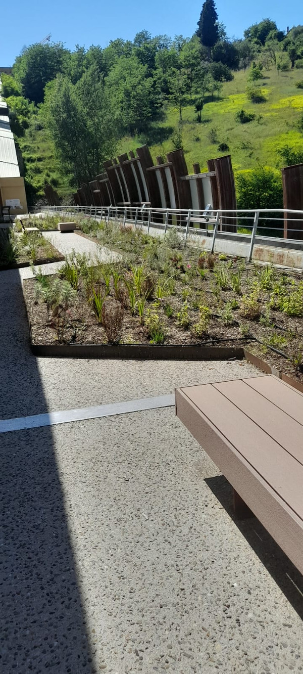 Oltre 1.600 piante per un giardino pensile di tipo estensivo, che occupa una superficie di 360 metri quadrati e risulta essere autosufficiente dal punto di vista idrico, con un sistema di raccolta dell’acqua piovana in apposite cisterne , che ne garantisce la periodica irrigazione.