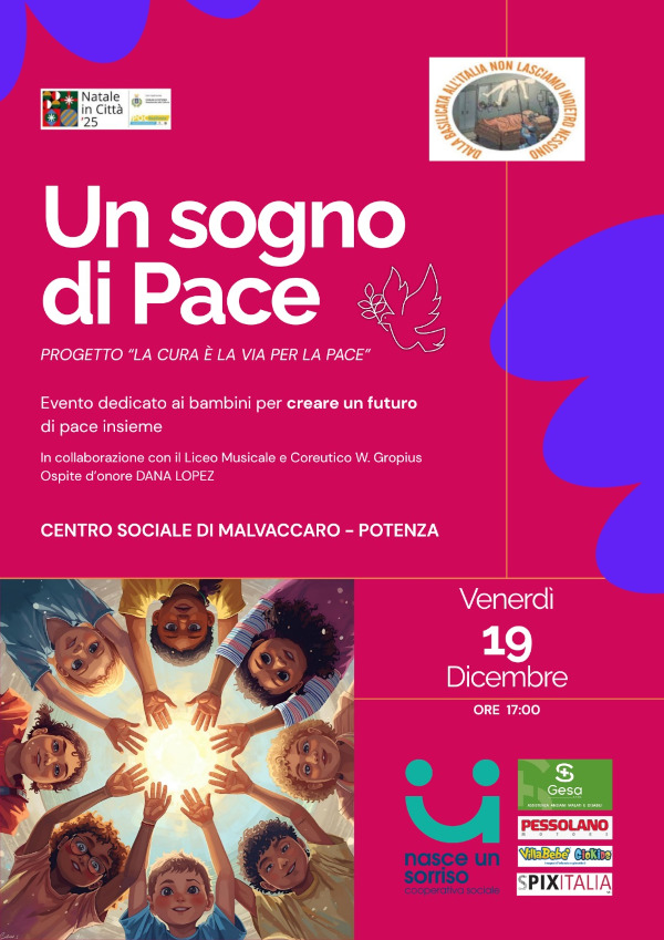 L’associazione “Dalla Basilicata all’Italia – non lasciamo indietro nessuno” presenta l’evento Un sogno di pace, inserito nel cartellone Natale in città promosso dal Comune di Potenza.