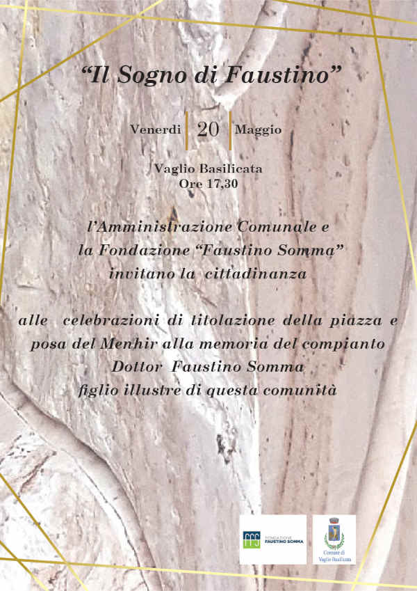 L’Amministrazione comunale di Vaglio e la Fondazione “Faustino Somma” invitano la cittadinanza alle celebrazioni di titolazione della piazza e posa del Menhir alla memoria del compianto dottor Faustino Somma, figlio illustre della comunità.