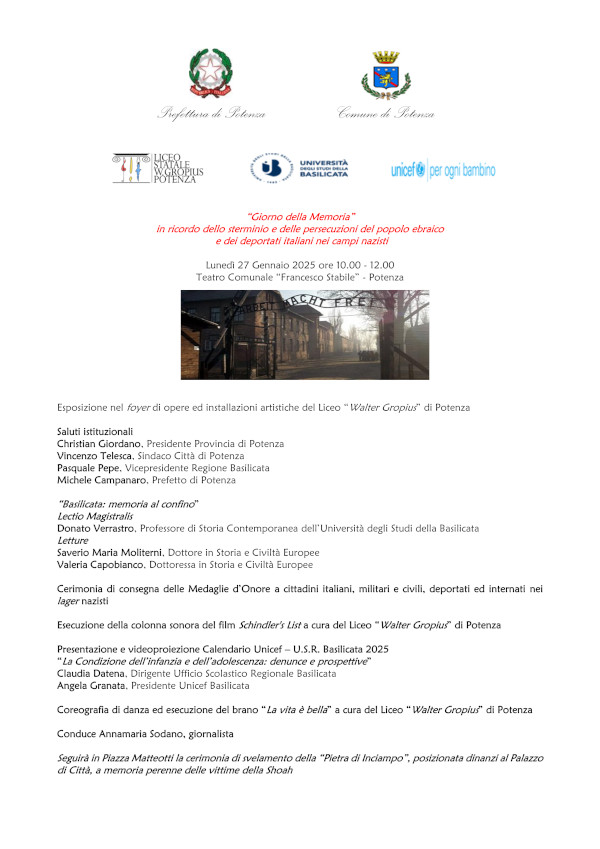 Lunedì 27 Gennaio prossimo, in occasione del “Giorno della Memoria”, presso il Teatro Comunale “Francesco Stabile” di Potenza, con inizio alle ore 10.00, un momento di riflessione sulla Shoah, sulle leggi razziali e sugli italiani che hanno subito la deportazione.