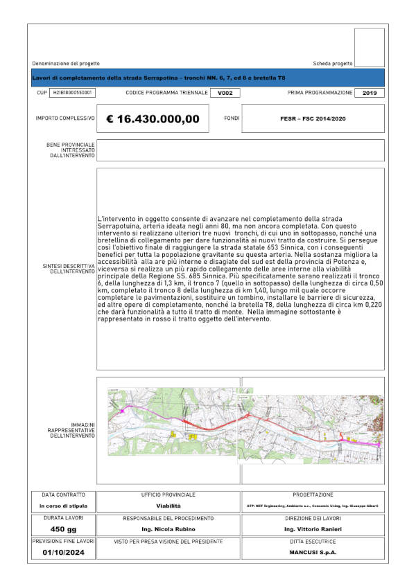 Nella sostanza migliora la accessibilità alla aree più interne e disagiate del sud est della provincia di Potenza e, viceversa si realizza un più rapido collegamento delle aree interne alla viabilità principale della Regione SS. 685 Sinnica“.
