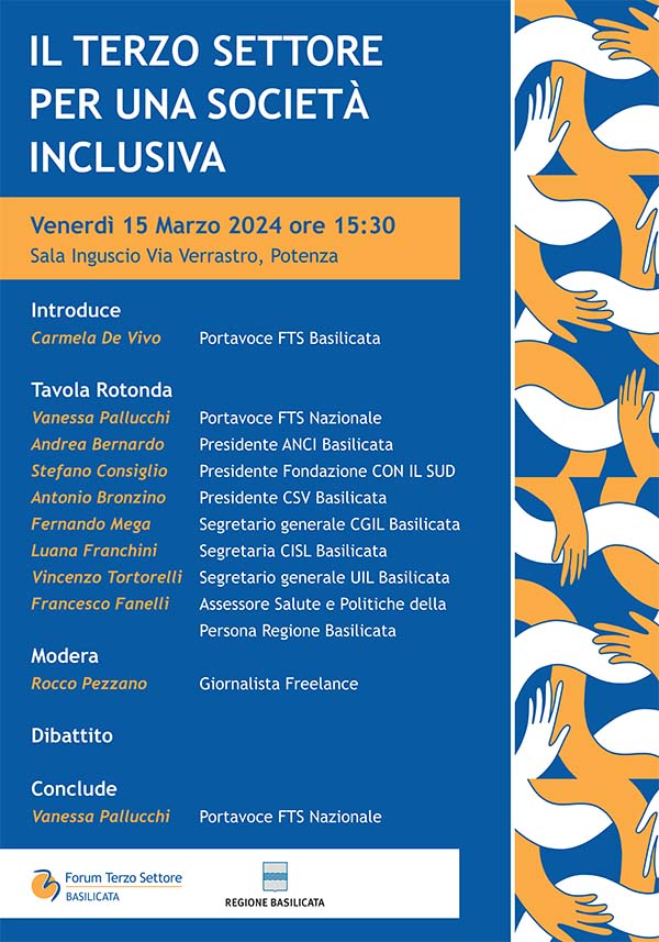Il prossimo 15 Marzo, alle 15.30 presso la Sala Inguscio (in viale Verrastro), il Forum Terzo Settore Basilicata presenterà pubblicamente il documento contenente le richieste programmatiche che il Terzo settore lucano intende portare all’attenzione delle forze politiche, in vista delle prossime elezioni.