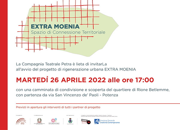 Sarà il momento inaugurale del progetto “Extra Moenia – Spazio di connessione territoriale”, risultato tra i vincitori dell’avviso pubblico Creative Living Lab – 3 edizione, promosso dalla Direzione Generale Creatività Contemporanea del Ministero della Cultura, e ideato da Compagnia teatrale Petra di Satriano di Lucania (PZ) insieme alla Casa Circondariale “Antonio Santoro” di Potenza e a Officine Officinali APS e con il patrocinio del Comune di Potenza.