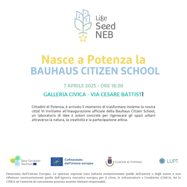 Sarà inaugurata il 7 Aprile 2025 alle ore 16:30 presso la Galleria Civica di via Cesare Battisti la Bauhaus Citizen School, la nuova piattaforma di partecipazione civica e progettazione collettiva promossa nell’ambito del progetto europeo LIFE SEED NEB.