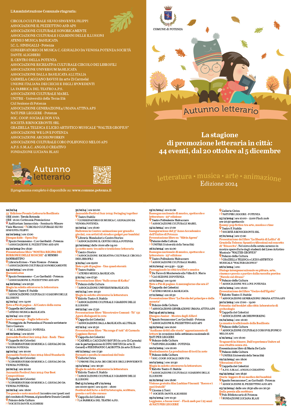 Sono 44 gli appuntamenti che, grazie a 28 partner, il Comune ha inserito nel cartellone dell’Autunno letterario 2024.