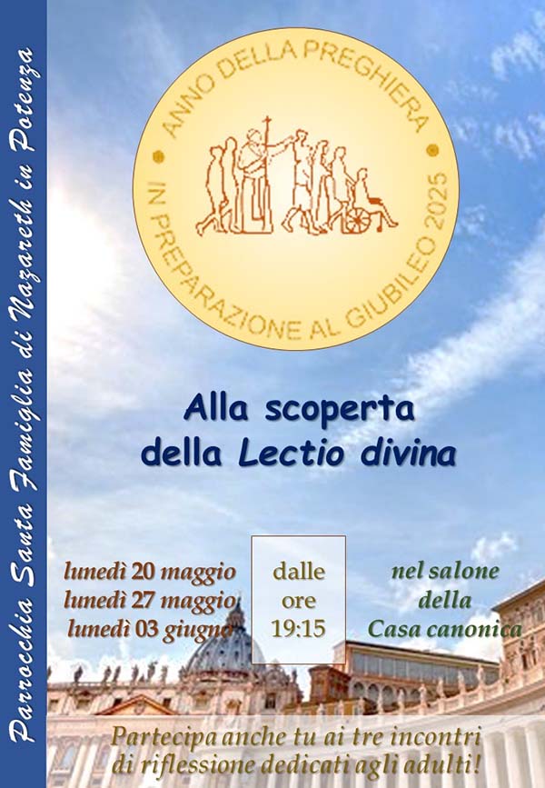 “Alla scoperta della Lectio divina”, è questo il nome del ciclo di tre incontri di riflessione che si terranno presso il salone della Casa canonica della Parrocchia Santa Famiglia di Nazareth di Potenza (Rione Rossellino) Lunedì 20 e 27 Maggio e 3 Giugno alle ore 19:15.