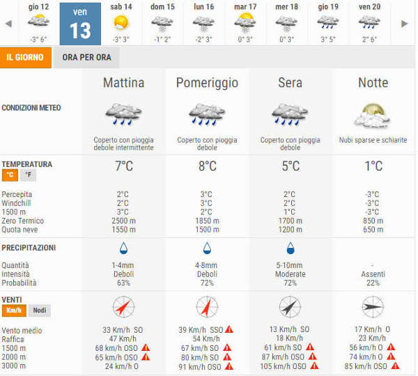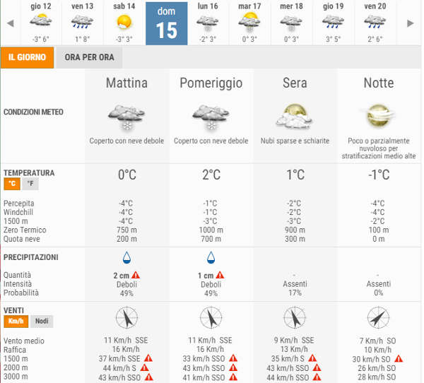 Sempre secondo le previsioni Sabato 14 Gennaio il cielo potrebbe essere ingannevole: dovremmo avere bel tempo con sole splendente per l’intera giornata, ma nella notte potrebbero arrivare le prime precipitazioni (con circa 1 centimetro di neve).
