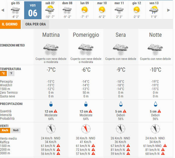 Secondo gli ultimi aggiornamenti meteo, nelle prossime ore continuerà a nevicare abbondantemente (sono previsti 34cm di neve) ma soprattutto avremo un brusco calo delle temperature.