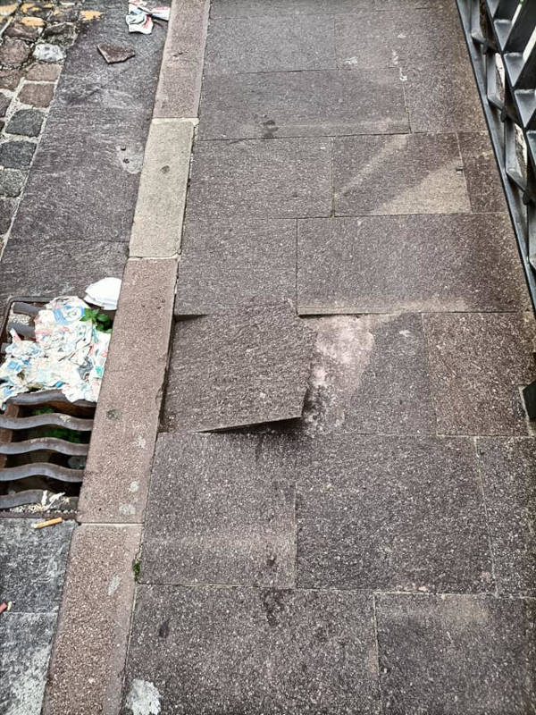 “In Via Viggiani, che, per chi non la conoscesse, è la strada che collega il ponte di Montereale con via Gabet e Portasalza, la mattonella rialzata del marciapiede ha causato un incidente che fortunatamente ha prodotto ‘soltanto’ uno spavento con caduta e forte impatto del ginocchio dx sullo stesso.