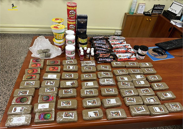 Sono stati sequestrati in totale, n. 9 sim telefoniche spagnole, 6 chili di hashish divisi in vari panetti e 7,86 chili di vari prodotti alimentari, aventi quali segni distintivi notissimi marchi nel mondo degli snack, risultati positivi alle analisi preliminari alla cannabis.