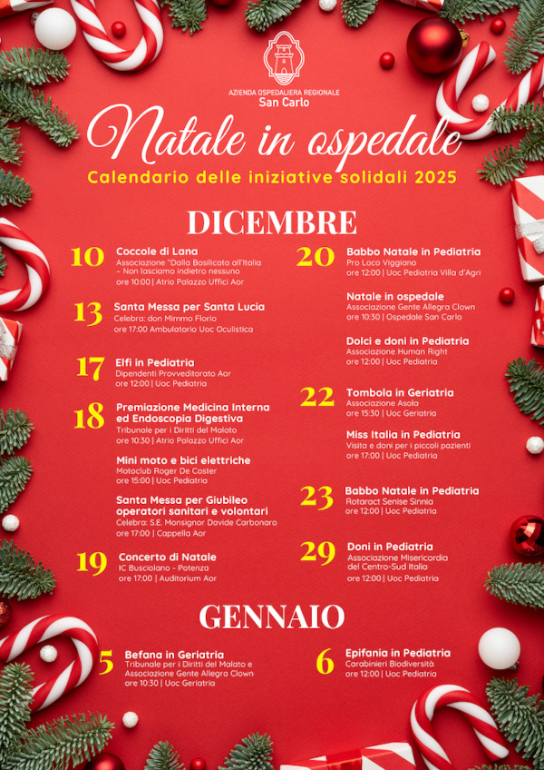 L’Azienda ospedaliera regionale San Carlo di Potenza presenta il calendario delle iniziative natalizie che, anche quest’anno, accompagneranno il periodo delle festività all’interno dei reparti.