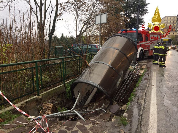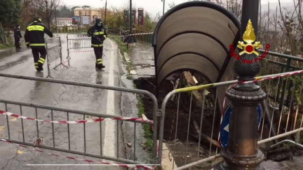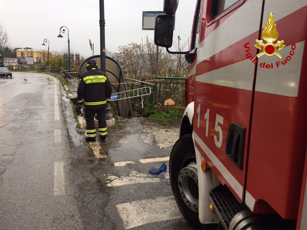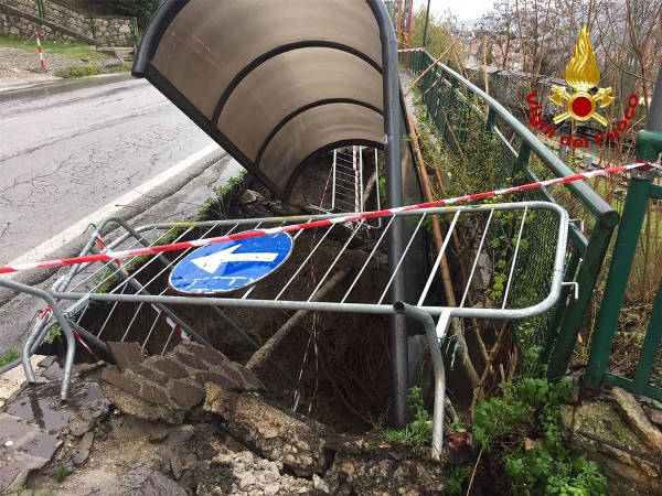 Le abbondanti precipitazioni hanno causato il cedimento del manto stradale, trascinando parte del marciapiede con tutta la pensilina fermata bus.