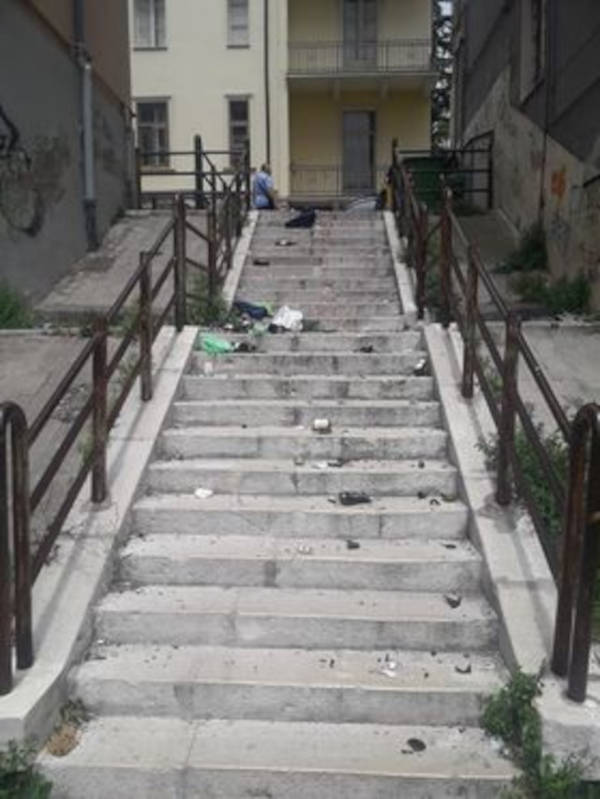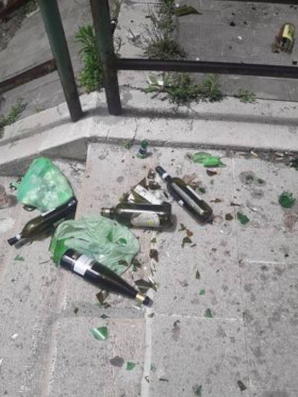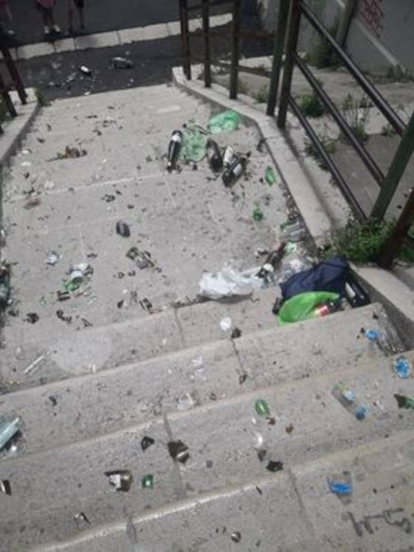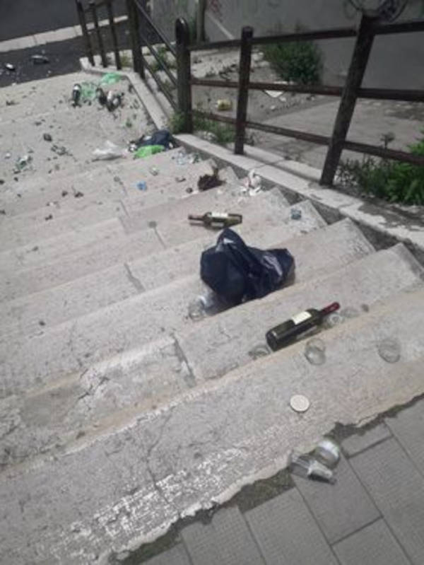 “Volevo denunciare questo atto di vandalismo: sulle scale Petrarca, dall’Inail a viale Dante, è pieno di bottiglie tutte rotte“.