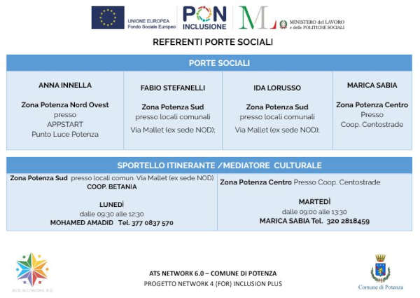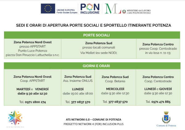 “Lo sportello è predisposto in ampliamento alle attività in essere delle Porte sociali del Comune di Potenza, realizzate con l’ATS ‘Network 6.0’ (costituita da Betania Società Cooperativa Sociale, Società Cooperativa C.S. – Cooperazione e Solidarietà-Consorzio Cooperative Sociali, Appstart Società Cooperativa sociale, Università Popolare lucana O.D.V., Associazione Insieme – Onlus, Società Cooperativa Sportiva Dilettantistica Pegaso-Cooperativa Sociale).