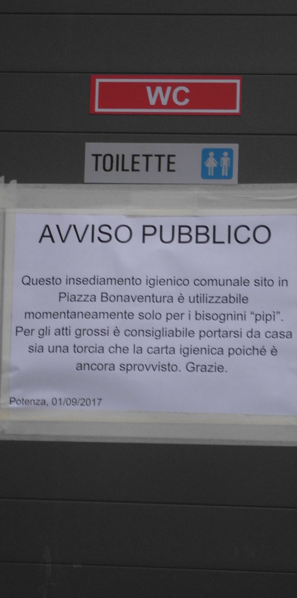 “Grazie al Dott. Gianfranco Smaldore dell’URP di Potenza, il giorno 31 agosto 2017 è stato informato l’ufficio Provveditorato del Comune affinchè i bagni pubblici di recente messi a nuovo, possano garantire un servizio ottimale per la cittadinanza tutta superando alcune problematiche esistenti.