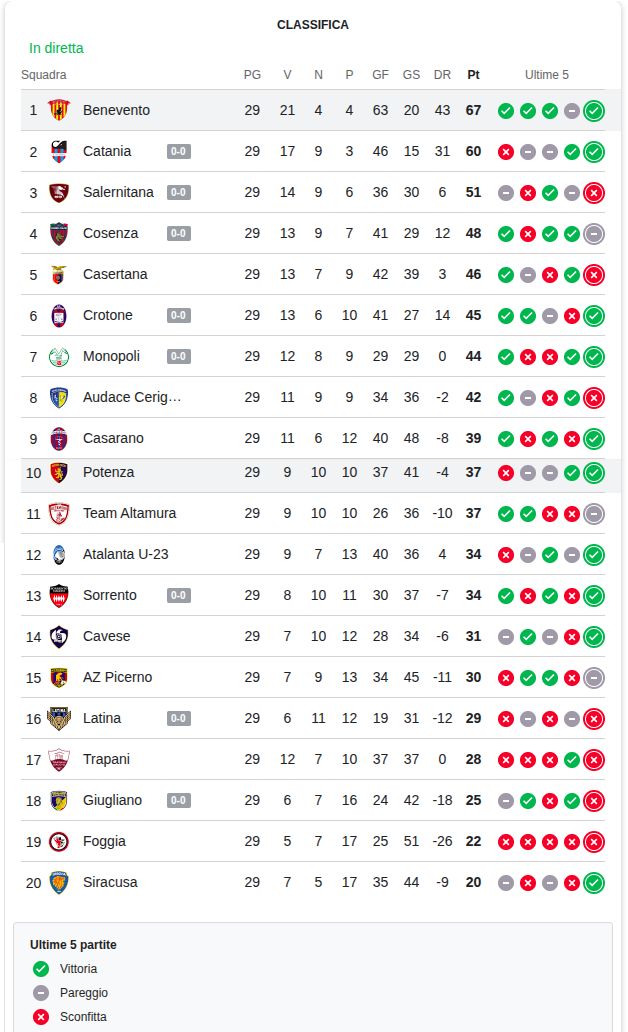 Sconfitta per il Potenza Calcio contro il Benevento.